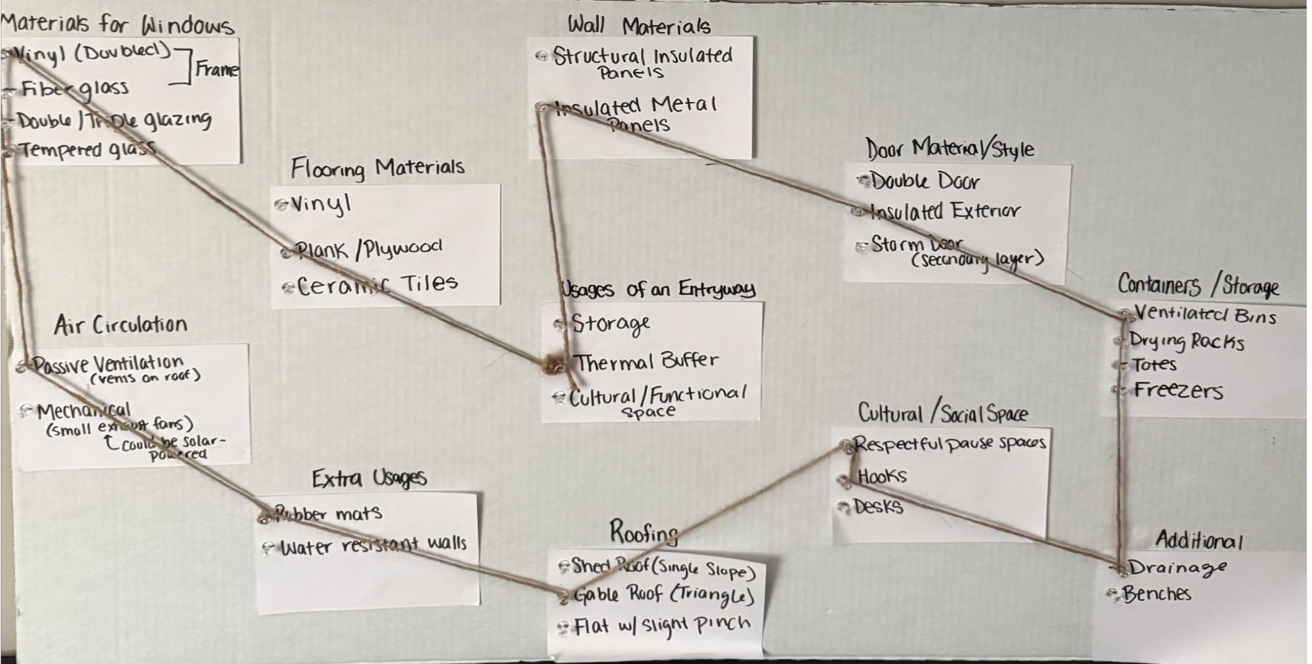 An interactive prototype designed to gather feedback from Alaska Native communities on Arctic entryways. Using string, images, and categories, participants link priorities like insulation, storage, and lighting to design elements, ensuring solutions reflect cultural values and real needs.